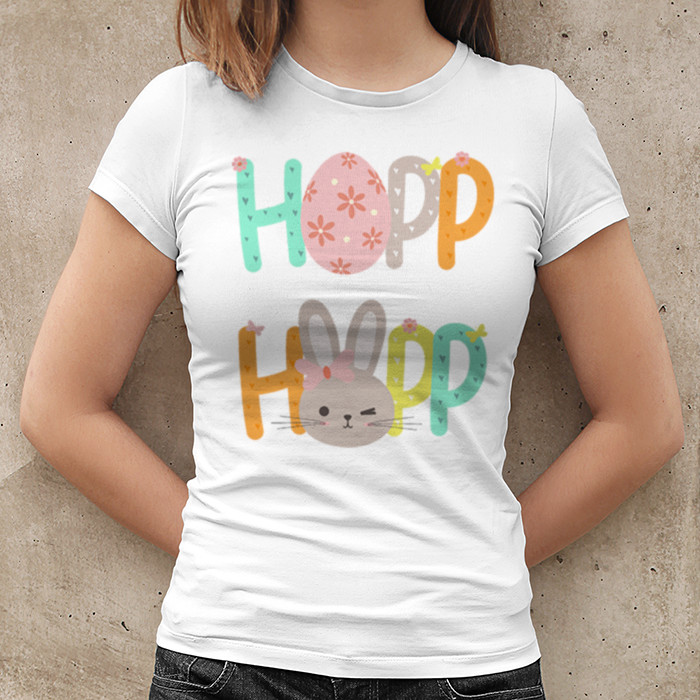 A Hopp-hopp húsvéti női póló tökéletes választás azoknak, akik vidám, tavaszi hangulatú ruhadarabot keresnek az ünnepekre. A grafika különlegessége, hogy a „Hopp-hopp” felirat „o” betűit egy húsvéti tojás és egy aranyos nyuszi fej díszíti, amely játékos és egyedi megjelenést ad a pólónak.